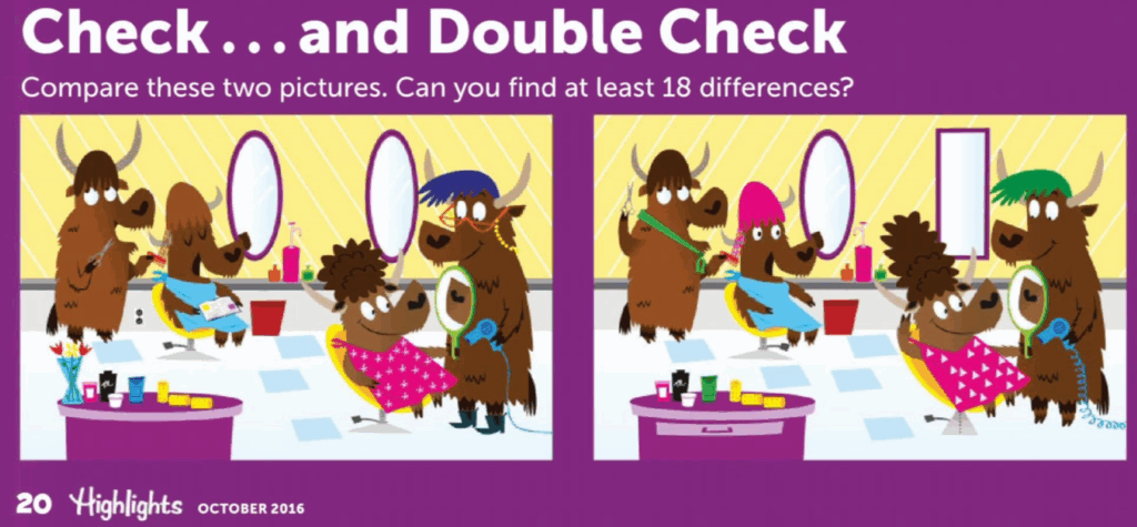 Image used by Judge Moore to illustrate the effect of focusing on differences rather than similarities between two “seemingly identical” images (Source: Highlights magazine, page 20)